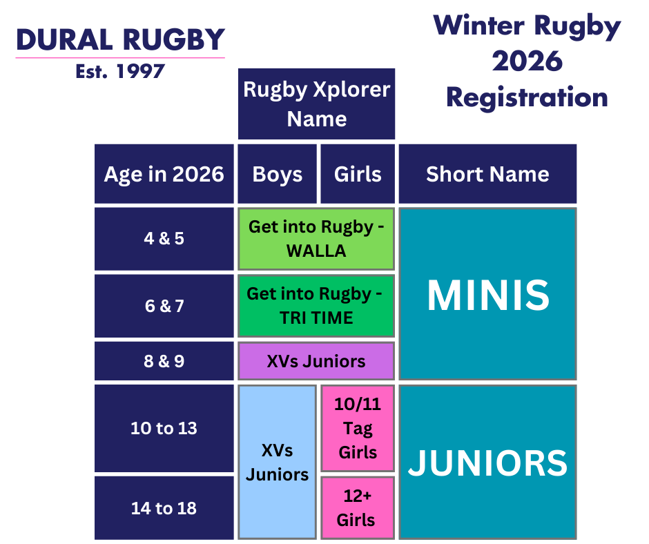 Minis will continue to play minis on Saturday morning, [AND IN 2026 we can also choose to play on Sunday Mornings!], with younger groups again playing modified TriTag, although you will register for “Get into Rugby – Walla”, “Get into Rugby Tri Time” or XVs Juniors.